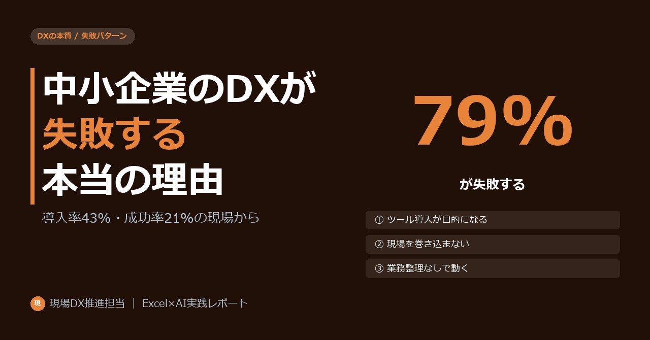 現場の支援データによると、中小企業のDX導入率は43%に達している。ところが、「業務が実際に変わった」と言える成功率は21%にとどまる。つまり、5社のうち4社は導入しても変わっていない。