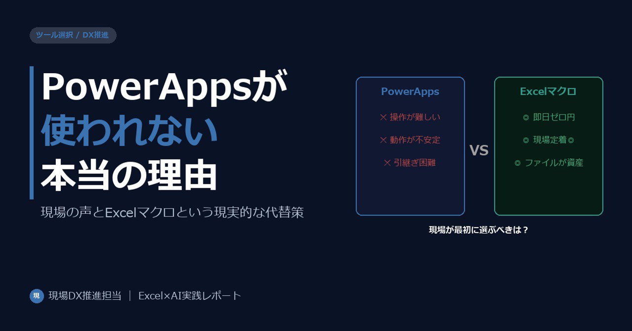ただ、現場のDX初期段階で「まず業務の効率化を1つ実現したい」という目標なら、ExcelマクロはPowerAppsより早く、確実に結果を出せる。具体的な使い方は「DX担当者が本当に使えるツールはどれか|PowerAppsより先にExcelマクロを選ぶべき理由」で詳しく解説している。