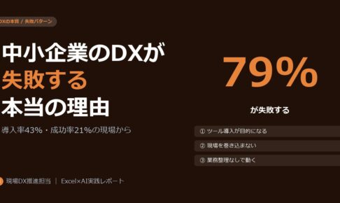 DXの本質 中小企業のDXが失敗する本当の理由|導入率43%・成功率21%の現場から 2026.04.06 kemari 中小企業のDX導入率は43%でも成功率はわずか21%。失敗の6割は「業務整理せずにツールを入れた」ことが原因。現場DX担当者が陥りがちな3つの失敗パターンと、成功への転換点を解説します。